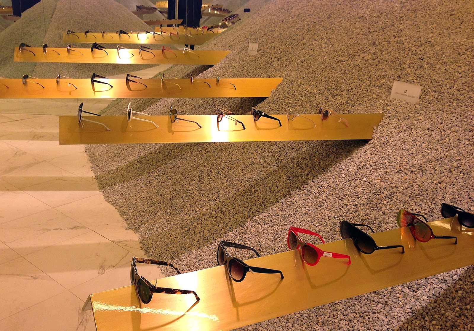 created an artistic installation that tests the boundaries of minimalism and balance. Part artistic installation, part eyewear boutique, the pop up--inside a shipping container parked at Pier 54--showcases Farrow's current line as well as collaborations with Oscar de la Renta, Jeremy Scott, Alexander Wang and others. Take your pick from the vast selection, poised delicately on beams held in place by piles of loose gravel. Hurry by, as the temporary retail space will fold on Christmas eve.